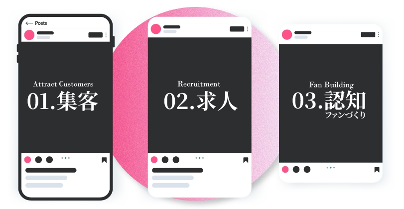 集客/求人/認知・ファンづくりの3つを軸に、目的から逆算してSNS運用を組み立てます。
